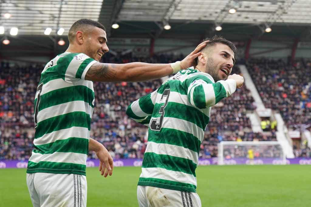 Heart of Midlothian v Celtic – Greg Taylor right celebrates scoring their side s fourth goal of the game during the cinch Premiership match at Tynecastle Park, Edinburgh. Picture date: Saturday October 22, 2022. Photo Jane Barlow