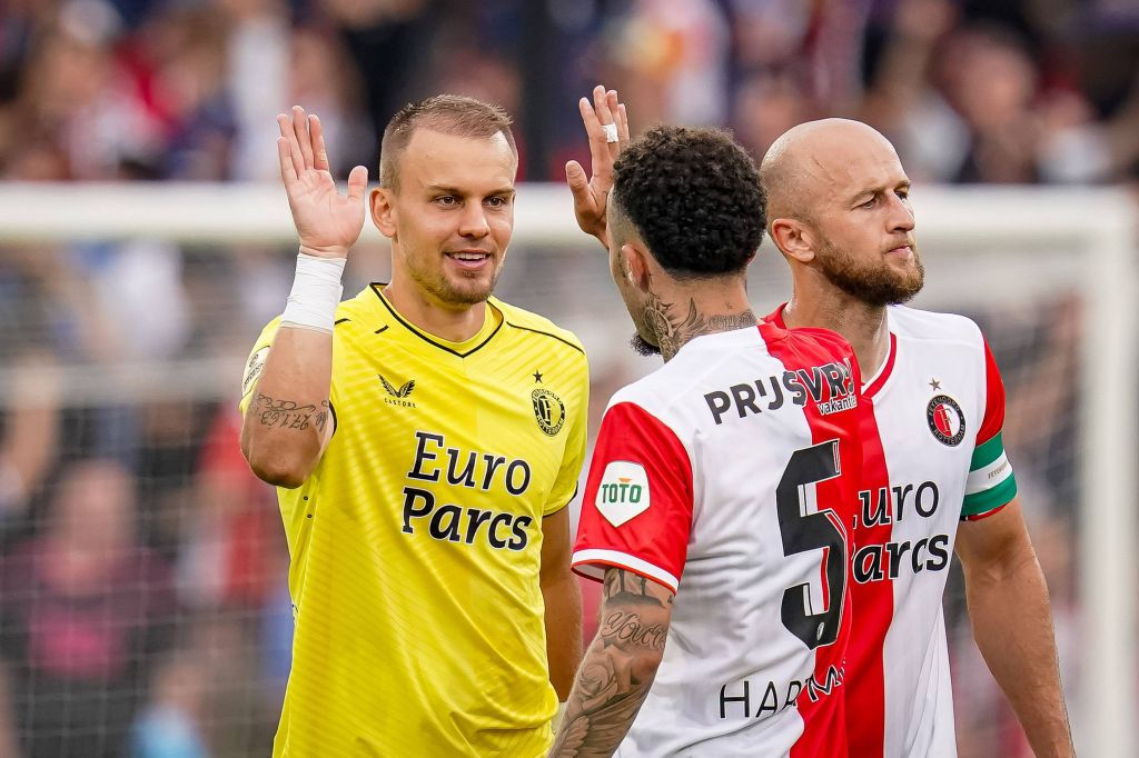 UTRECHT, 16Ã09-2023, Stadium Feijenoord / De Kuip , Dutch Eredivisie , season 2023 / 2024, Feyenoord – SC Heerenveen , result 6-1 , Feyenoord goalkeeper Timon Wellenreuther with Feyenoord defender Quilindschy Hartman r Feyenoord – Heerenveen