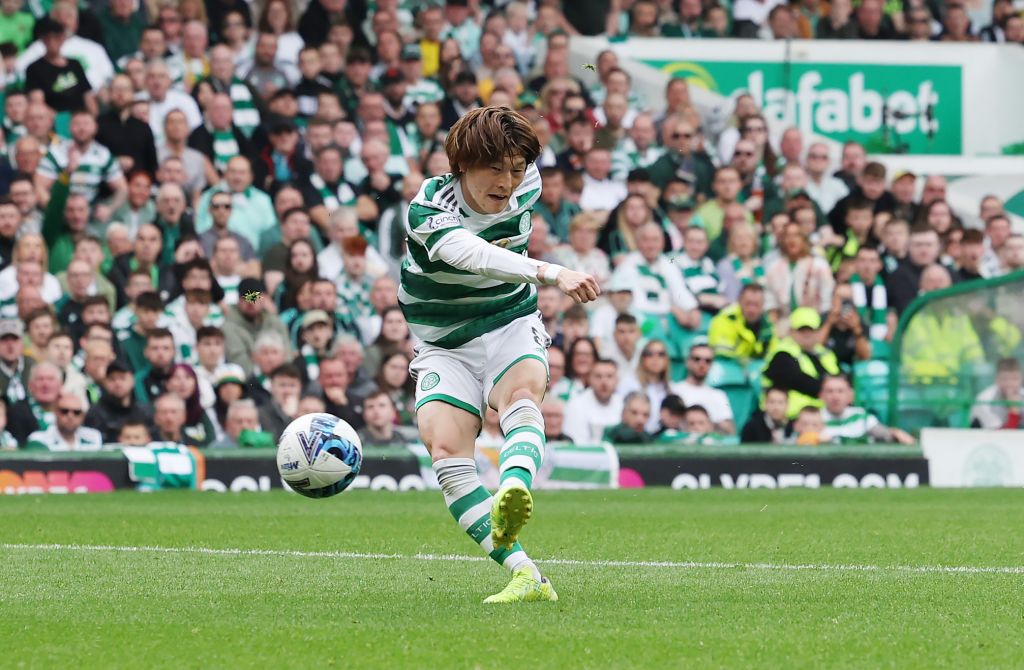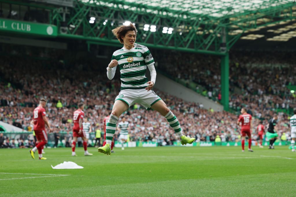 Kyogo Furuhashi of Celtic scores his team’s opening goal during the Cinch Scottish Premiership match between Celtic and Aberdeen at Celtic Park Stadium on May 24, 2023 (Photo by Ian MacNicol/Getty Images)