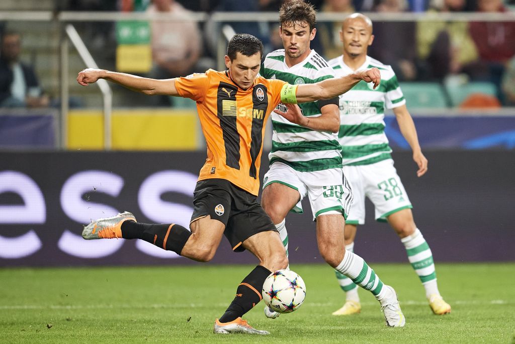 Taras Stepanenko of FC Shakhtar Donetsk fights for the ball with Matthew O’Riley of Celtic FC during the UEFA Champions League group F match between Shakhtar Donetsk and Celtic FC at The Marshall Jozef Pilsudski’s Municipal Stadium of Legia Warsaw on September 14, 2022 in Warsaw, Poland. (Photo by Adam Nurkiewicz/Getty Images)