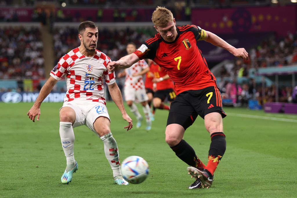 Kevin De Bruyne of Belgium crosses the ball past Josip Juranovic of Croatia during the FIFA World Cup Qatar 2022 Group F match between Croatia and Belgium at Ahmad Bin Ali Stadium on December 01, 2022 in Doha, Qatar. (Photo by Lars Baron/Getty Images)