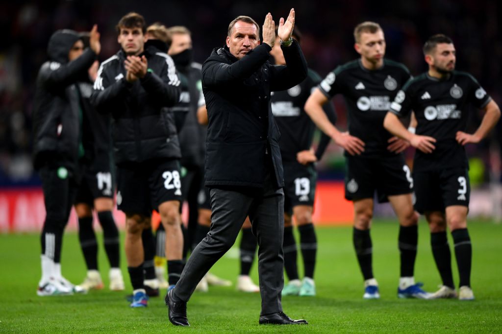 Celtic’s Northern Irish coach Brendan Rodgers gestures during a press conference at the Metropolitano stadium in Madrid, on November 6, 2023, on the eve of their UEFA Champions League Group E football match against Club Atletico de Madrid. (Photo by OSCAR DEL POZO/AFP via Getty Images)