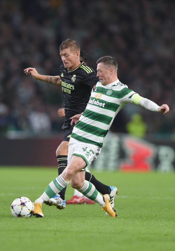 Glasgow, Scotland, 6th September 2022. Toni Kroos of Real Madrid and Celtic captain Callum McGregor during the Champions League match at Celtic Park, Photo Neil Hanna / Sportimage