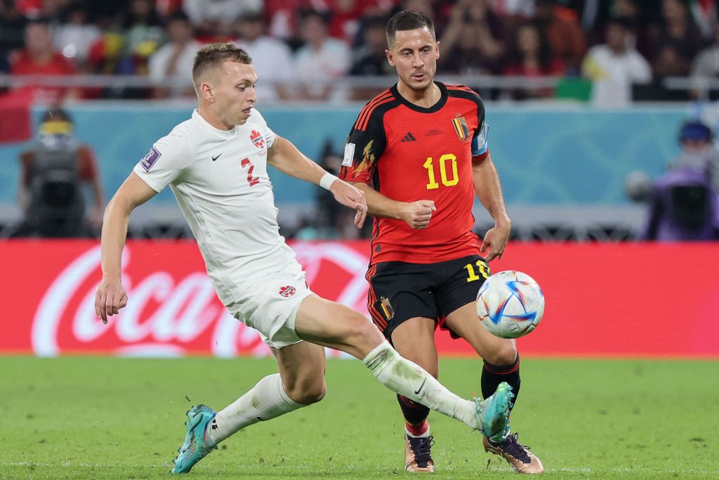 Canada’s defender #02 Alistair Johnston fights for the ball with Belgium’s forward #10 Eden Hazard during the Qatar 2022 World Cup Group F football match between Belgium and Canada at the Ahmad Bin Ali Stadium in Al-Rayyan, west of Doha on November 23, 2022. (Photo by JACK GUEZ/AFP via Getty Images)