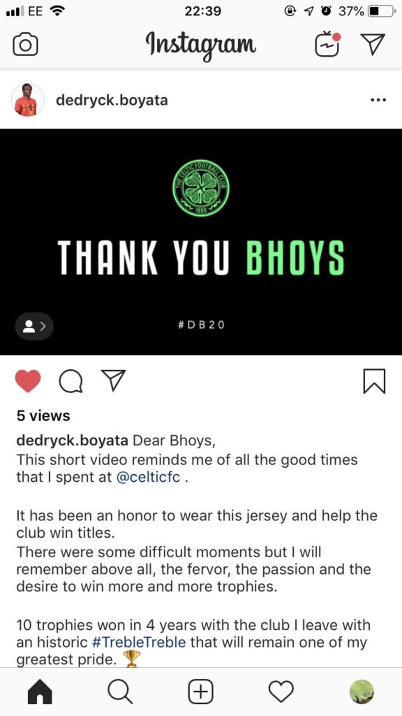 That is not to say that Boyata hasn’t got strong feelings for Celtic, he clearly has. In his social media Thank You Bhoys posted a short video that ‘reminds me of al the good times that I spent at Celtic.