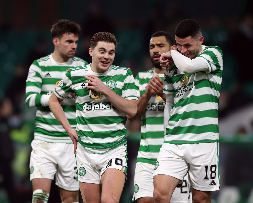 James Forrest and Tom Rogic of Celtic are seen at full time during the Cinch Scottish Premiership match between Celtic FC and St. Mirren FC at on March 02, 2022. (Photo by Ian MacNicol/Getty Images)