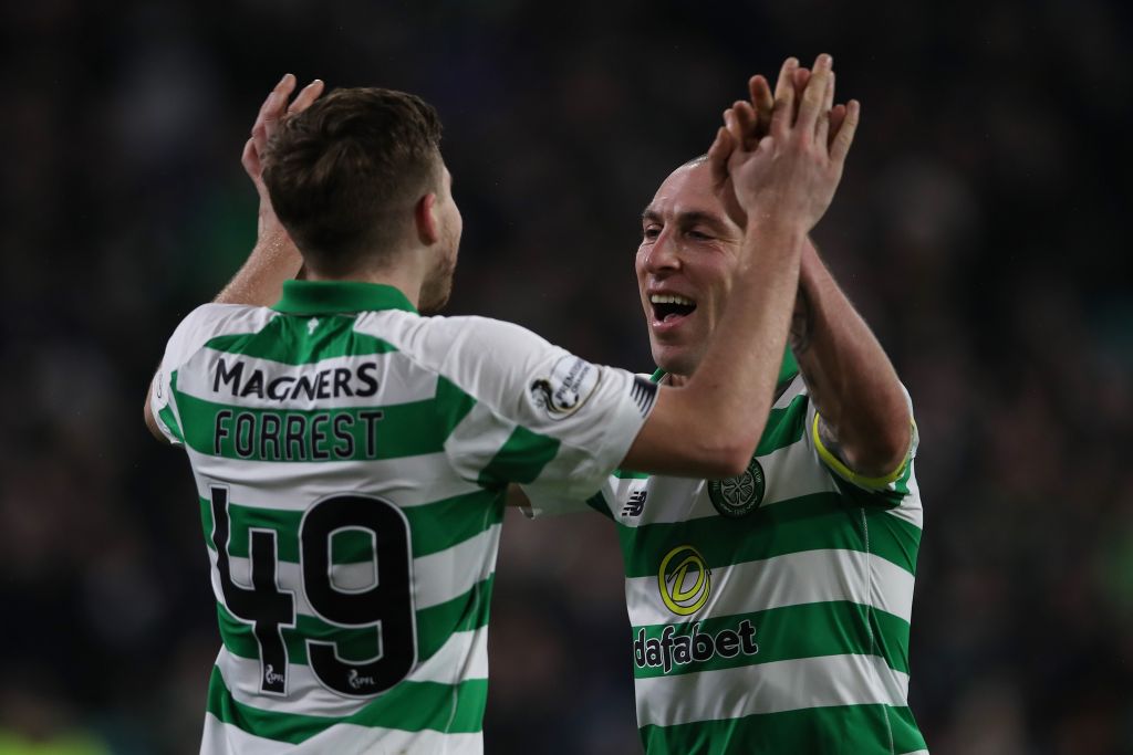 James Forrest of Celtic celebrates with Celtic captain Scott Brown after scoring his team’s fourth goal during the Ladbrokes Premiership match between Celtic and Livingston at Celtic Park on November 23, 2019.. (Photo by Ian MacNicol/Getty Images)