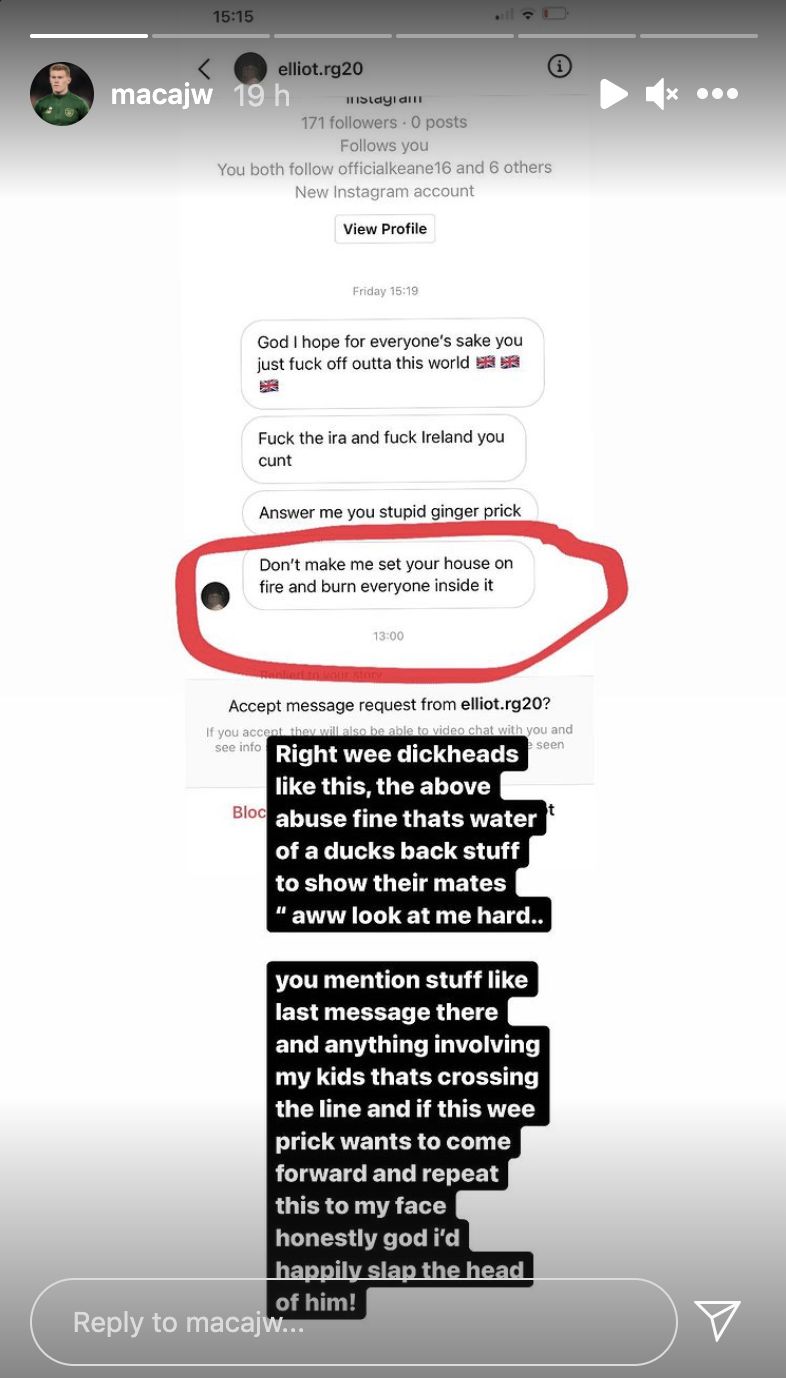 Now though it has gone too far with threats being made to his young family. “Don’t make me set your house on fire and burn everyone inside it,” is just one of the chilling, abusive and often racist messages James McClean has received since his Instagram post on Friday. It’s also the one he’s taken particular exception to as you can see below.