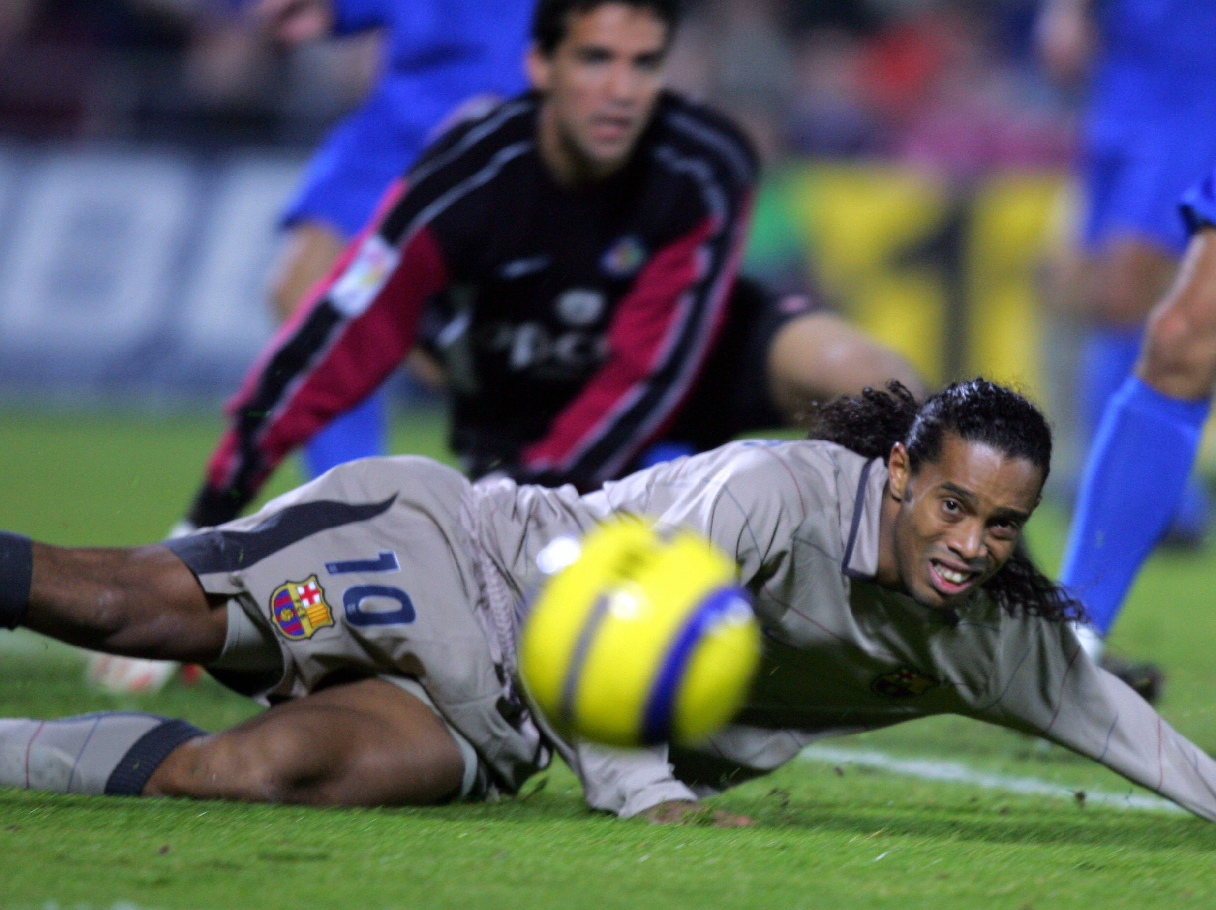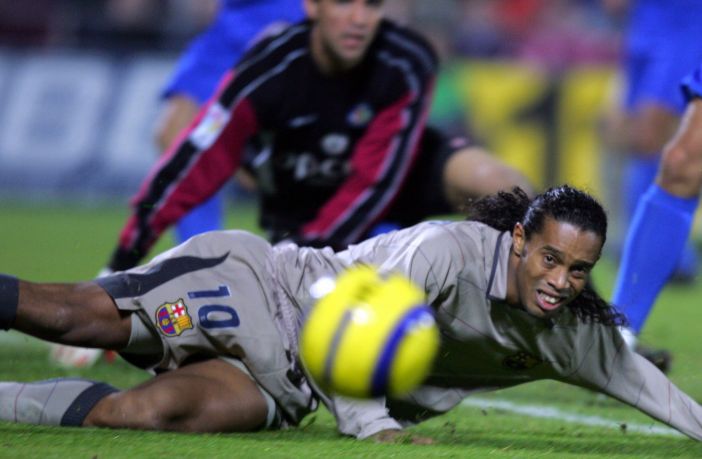 GETAFE, SPAIN: Barcelona’s Brazilian Ronaldinho (down) looks at the ball after missing a goal in front of Getafe’s goalkeeper Francisco Sanchez Broto during their Spanish Premier League football match at Alfonso Perez stadium in Getafe near Madrid. 27 November, 2004. Barcelona won 2-1. (Photo JAVIER SORIANO/AFP via Getty Images)