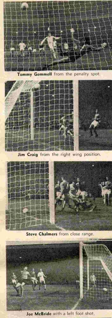 The team on the night was Simpson, Craig, Gemmell, Murdoch, McNeill, Brogan, Johnstone, Wallace, Chalmers, McBride, Hughes and the crowd of 75,000 was not happy in the first half as Celtic seemed off the pace. Right on half-time, though, the Hoops got a break when Joe McBride was grabbed in a head-lock by a defender and the Czech referee awarded a penalty in spite of vociferous protests by the St Etienne players. Tam Gemmell made no mistake from the spot.