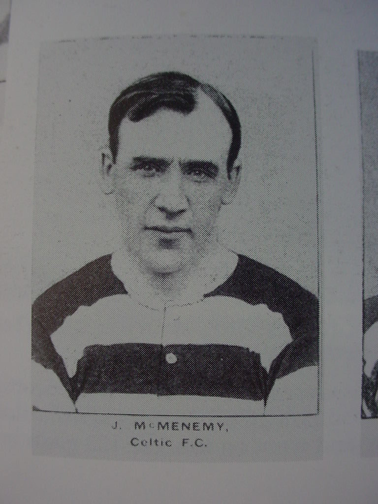 Jimmy McMenemy was one of the really great Celtic players. He was born in 1880 and played from 1902 until 1920 at a time when Celtic had two really great teams, 1905-1910 and 1914 – 1917, and when the managerial powers of Willie Maley were at their height. In some ways, McMenemy typified the Celtic of that era – a tricky dribbler, a brilliant passer, a cannonball shot (unusual in such a small and slightly built man) and a great team player with loyalty and level-headedness his hallmarks.