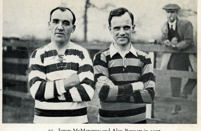 He joined Celtic from Rutherglen Glencairn, signing, legend has it, “up a close in Union Street”, as Maley began his ingathering of talent. His first season was no great success, but by the end of 1904, the first great Celtic team had taken off, and the forward line of Bennett, McMenemy, Quinn, Somers and Hamilton had no equal in world football. For six years they won the Championship with the crafty McMenemy holding the ball, slowing things down, reading Quinn perfectly for the incisive pass and performing a vital link in the right wing triangle with Sunny Jim and Alec Bennett which exuded excellence.