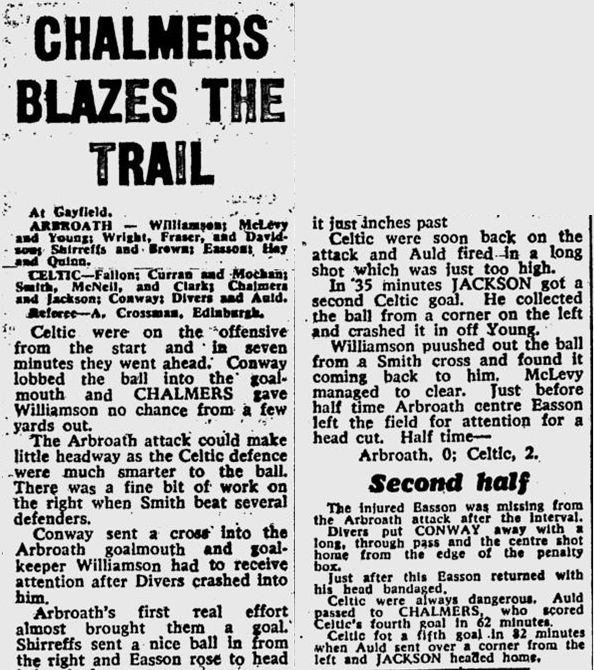 The Bully Wee maintained their unbeaten start with the equaliser 12 minutes after the restart, centre-forward Ian Meek arriving a fraction of a second before John Fallon to divert Alex Wilson’s cross into the net. Nevertheless, the media were fulsome in their praise of Celtic’s latest star, this from the Sunday Post.