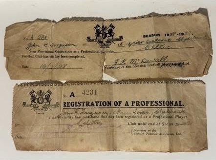 1928/29 – On 14 July 1928, John signed Provisional forms for Celtic for season 1928/29. At that time, he lived at 10 (or 18) Greer Quadrant, Clydebank.