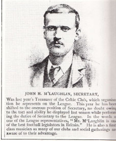McLaughlin was at the preliminary meetings held to establish Celtic, including the meeting on 7 November 1887, when the club was officially constituted. A member of the original committee, McLaughlin was elected as club Treasurer in 1890, becoming the youngest office bearer in the process. A year later, at the 1891 AGM, he became club Secretary. This post was held by John for two years, when he was elected Vice-President in 1893.