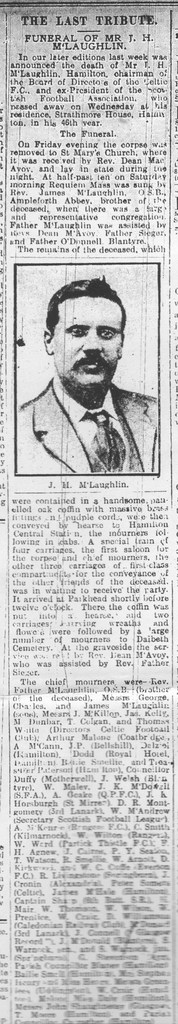 Mr. McLaughlin died at his residence, Strathmore, Hamilton. He was one of the founders of the Celtic Football Club in 1888 and on its formation as a Limited Liability Company in 1897 he became chairman. He also acted as secretary and treasurer of the club at various times. He took an active interest in the affairs of the Scottish Football Association, serving for a time as its president, and also filled the office of treasurer. He represented Scotland on the Football International Board, and his opinion on football matters commanded much respect on both sides of the Border. Kindred sports also claimed a good deal of Mr. McLaughlin’s attention, especially bowling, and he was president for three years of the Hamilton Caledonian Club.