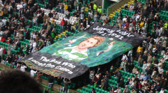 In 2006, as the 25th anniversary of Johnny Doyle’s death approached, the Jungle Bhoys supporters group organised a fundraiser in MacConnell’s bar in Glasgow city centre to raise monies for a banner in his honour. In attendance that night were Johnny’s sister Anne-Marie and his daughter Joanna. With their help a memorial booklet of Johnny was produced which, along with the fundraising night and specially-made postcard, helped raise the necessary monies for the banner – which was proudly unfurled on the 21 October 2006 at Celtic Park before a game against Motherwell.