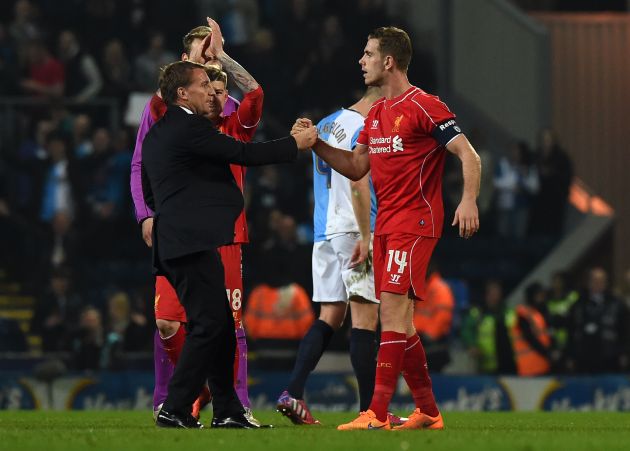 Liverpool manager Brendan Rodgers celebrates with Jordan Henderson after the English FA Cup quarter-final replay match between Blackburn Rovers and Liverpool at Ewood Park in Blackburn, on April 8, 2015. (Photo PAUL ELLIS/AFP via Getty Images)