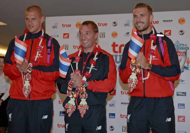 Liverpool football manager Brendan Rodgers and his players Jordan Henderson (R) Martin Skrtel (L) give a traditional greeting to the media upon arriving at Suvarnabhumi International airport in Bangkok on July 13, 2015. (Photo PORNCHAI KITTIWONGSAKUL/AFP via Getty Images)