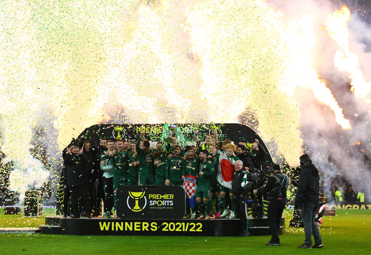 19th December 2021; Hampden Park, Glasgow, Scotland; Scottish League Cup final, Hibernian versus Celtic: Celtic players celebrate with the trophy