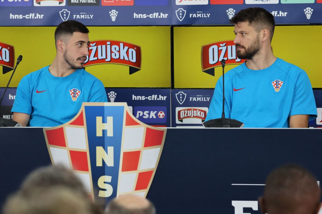 Croatia’s forward #16 Bruno Petkovic (R) speaks to Croatia’s defender #22 Josip Juranovic during a press conference in Doha on December 11, 2022, ahead of their Qatar 2022 World Cup football semi-final match against Argentina.  (Photo by JACK GUEZ/AFP via Getty Images)