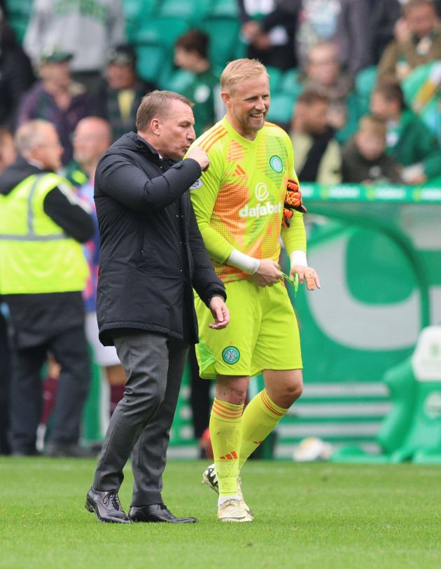 Celtic manager Brendan Rodgers with Celtic goalkeeper Kasper Schmeichelafter the match. Copyright: Robert Perry