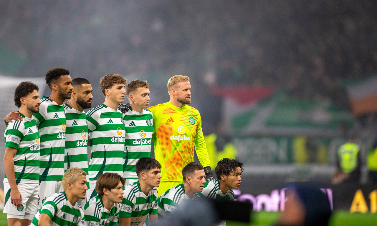 Celtic players pose for a team photo on the pitch prior to the UEFA Champions League match between Celtic FC and RB Leipzig at Celtic Park on November 05, 2024. (Photo by Ian MacNicol/Getty Images)