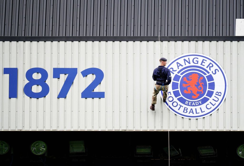 Rangers v Aberdeen – cinch Premiership – Ibrox Stadium A member of the British armed forces abseils from the roof of the stadium before the cinch Premiership match at Ibrox on Saturday September 30, 2023. Photo Jane Barlow