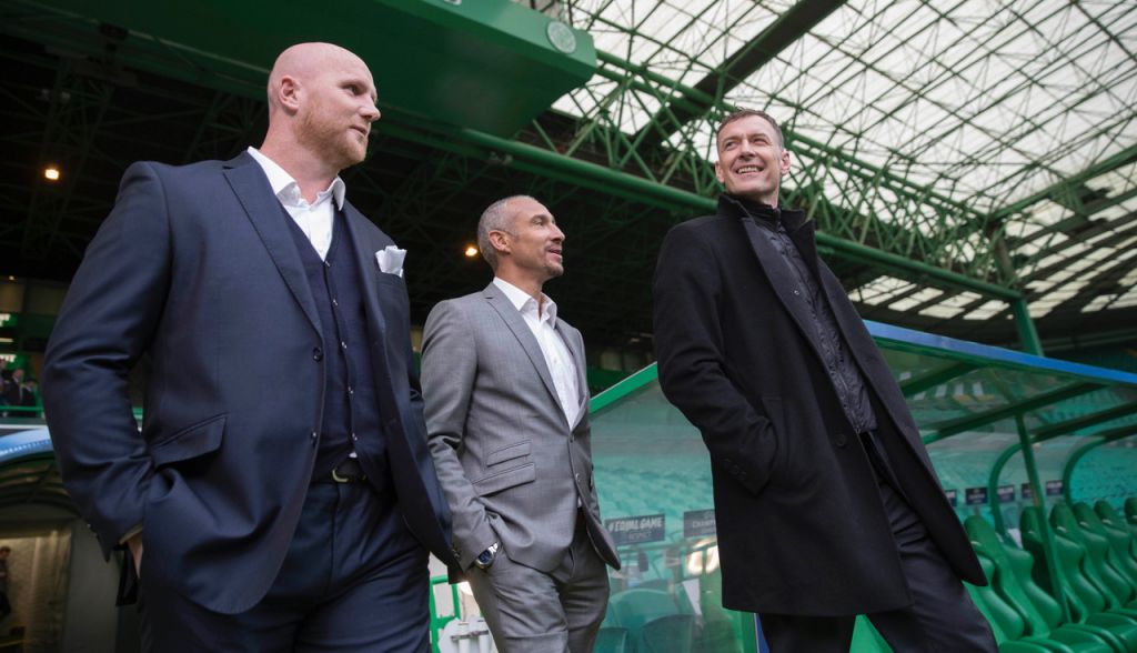 Celtic Legends arrive at Parkhead (L-R) John Harrison, Henrik Larsson and Chris Sutton before the UEFA Champions League Match between Celtic and Paris Saint Germain at Celtic Park Stadium on September 12, 2017.. (Photo by Steve Welsh/Getty Images)