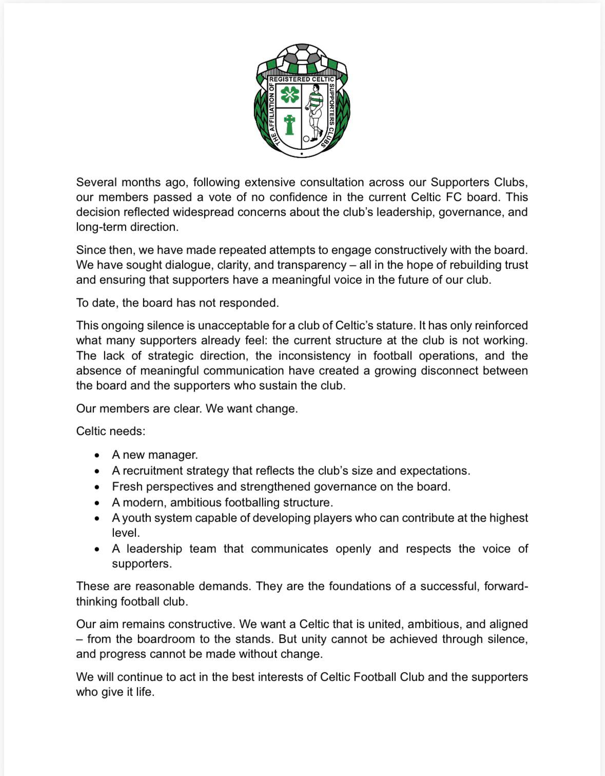 The Affiliation calls for a new manager, a recruitment strategy that reflects the clubs size and expectations, fresh perspectives and strengthened governance on the board, a modern, ambitious footballing structure, a youth system capable of developing players who can contribute at the highest level, a leadership team that communicates openly and respects the voice of the supporters.