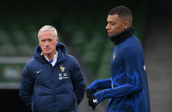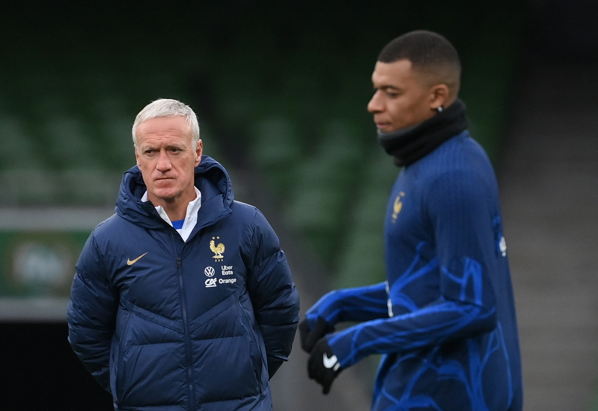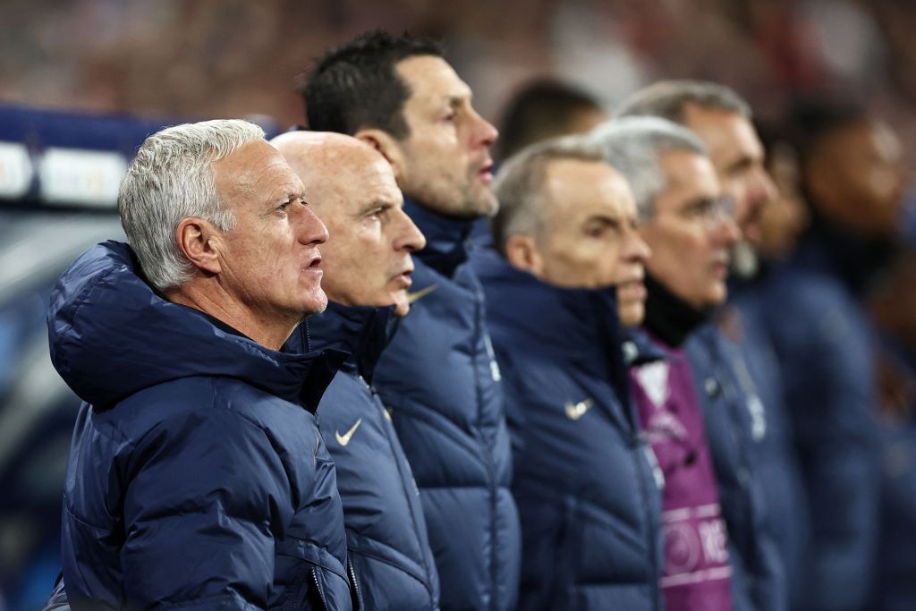 French staff members, including France’s head coach Didier Deschamps and France’s assistant coach Guy Stephan, sing the national anthem, the UEFA Euro 2024 qualification match between France and Netherlands at the Stade de France in Saint-Denis, Paris, on March 24, 2023. (Photo by ANNE-CHRISTINE POUJOULAT/AFP via Getty Images)