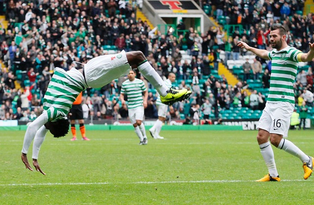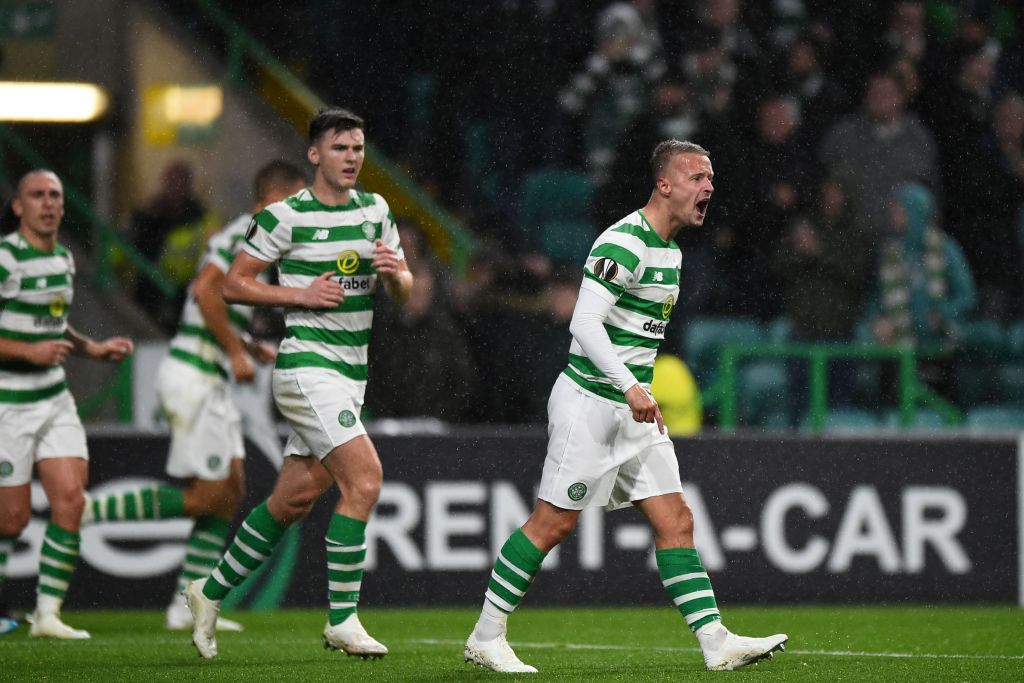 Celtic’s Scottish striker Leigh Griffiths (R) reacts after scoring the only goal during the UEFA Europa League group B football match between Celtic and Rosenborg at Celtic Park stadium in Glasgow, Scotland on September 20, 2018. – Celtic won the game 1-0. (Photo ANDY BUCHANAN/AFP via Getty Images)
