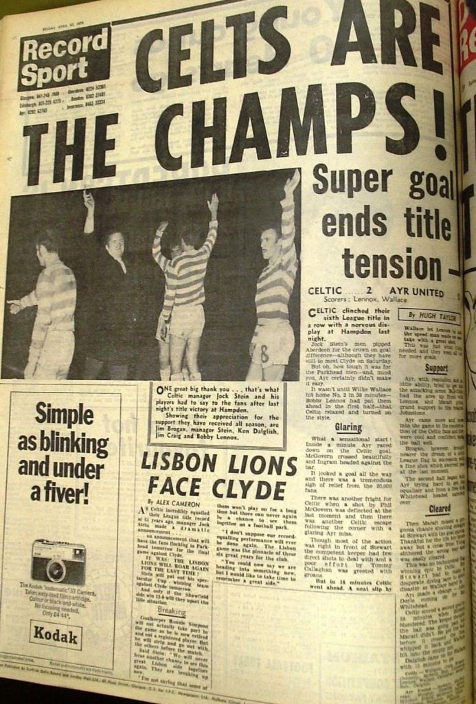 With the main stand at Celtic Park undergoing major refurbishment, the home game with Ayr United two nights later was played at Hampden. I recall it being a miserable, wet night and a low-key atmosphere for what would be a flag-winning fixture. Who else but Bobby Lennox would open the scoring within 20 minutes, with Willie Wallace sealing the points and the title on the hour.