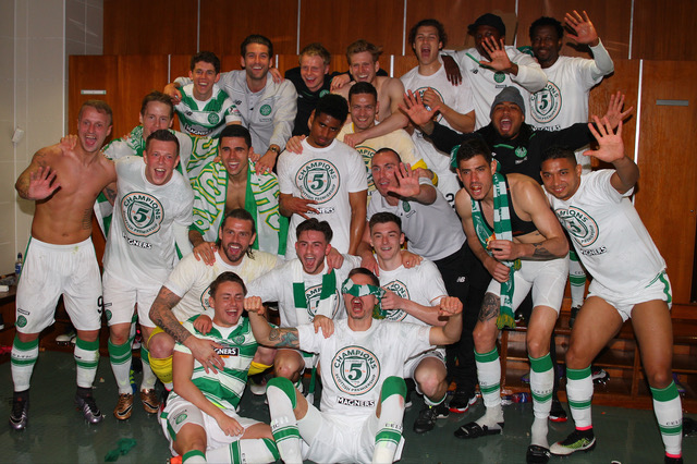 Celtic versus Aberdeen. Celtic players celebrate in the dressing room after clinching 5 in a row in 2016
