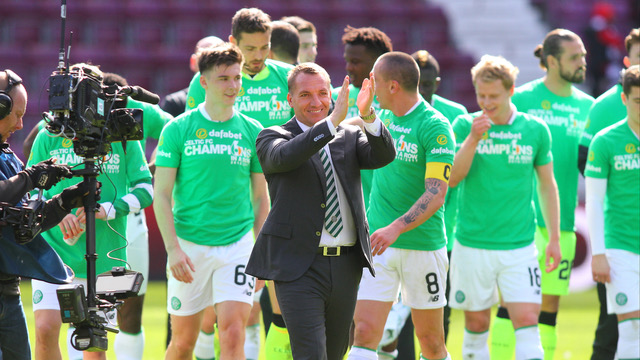 Brendan Rodgers leads the Celtic players to the supporters after clinching 6 in a row in April 2017