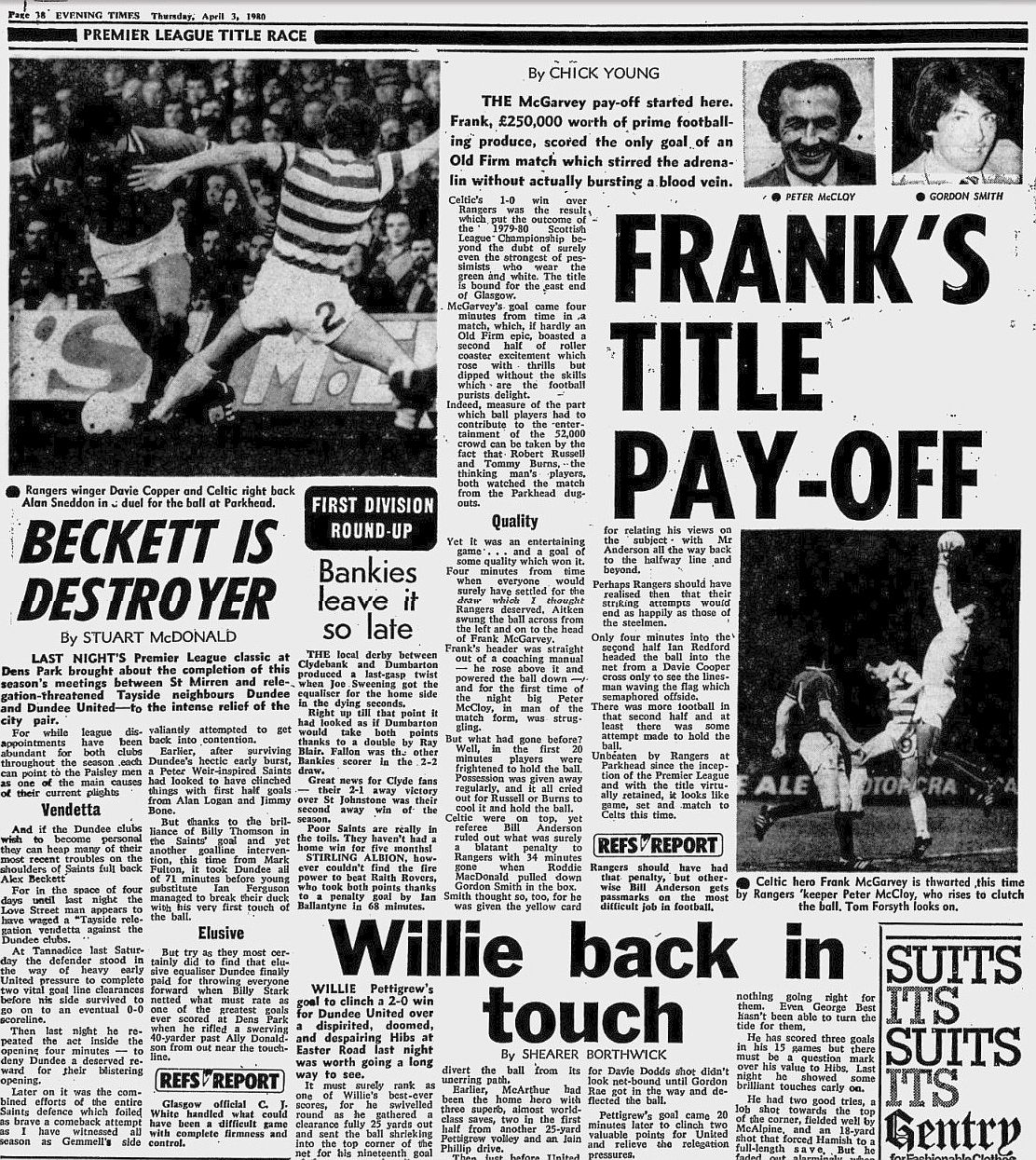 Afterwards John Clark noted that the ink had now dried on that contract! Amazing what a winner against Rangers gets you. Here’s the 2nd edition of “I’m Frank and He’s Tommy Podcast” and below is a press cutting from that game on 2 April 1980…