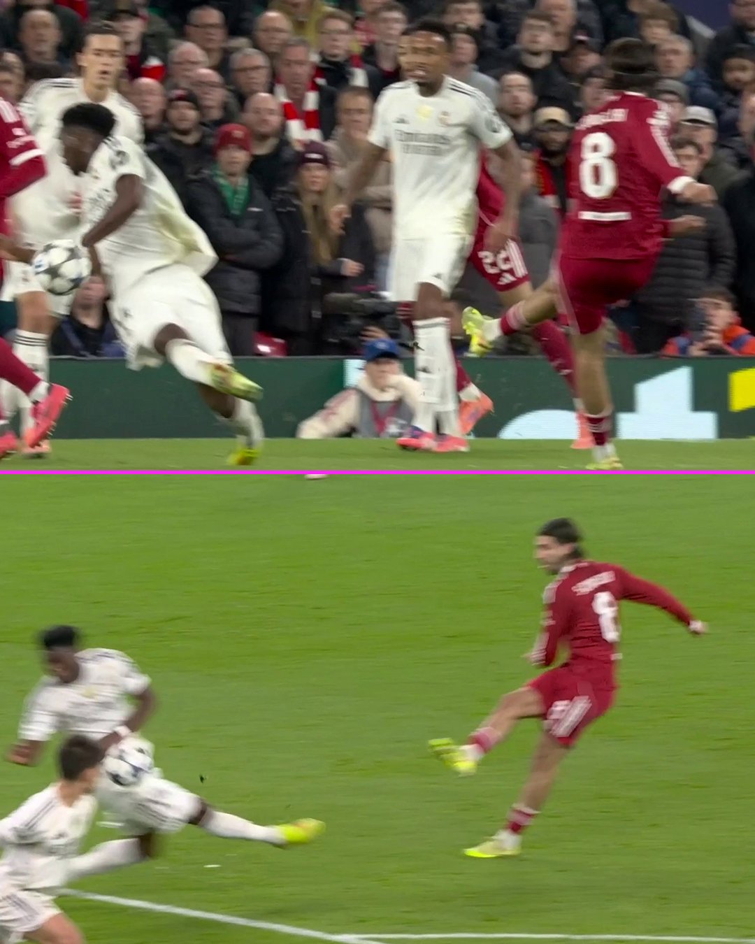 Man in the middle Istvan Kovacs adjudged Real Madrid’s Aurelien Tchouameni to have handled a goal bound effort from Dominik Szoboszlai, and free kick awarded on the edge of the area.