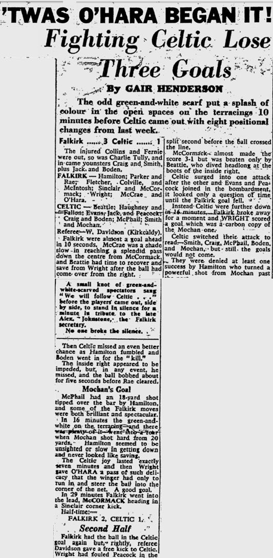 Neil Mochan opened the scoring for Celtic, but the Bairns hit back to win 3-1. In an era of somewhat bizarre selection decisions at Parkhead, defender Alex Boden was Billy’s right-wing partner, the first but not the last time that would happen that season.