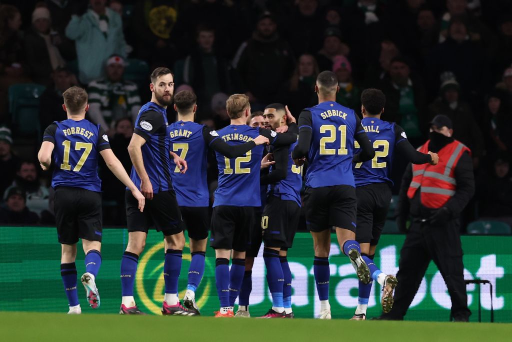 Josh Ginnelly celebrates with teammates after scoring the first goal during the Cinch Scottish Premiership match between Celtic FC and Heart of Midlothian at Celtic Park on March 08, 2023 (Photo by Ian MacNicol/Getty Images)