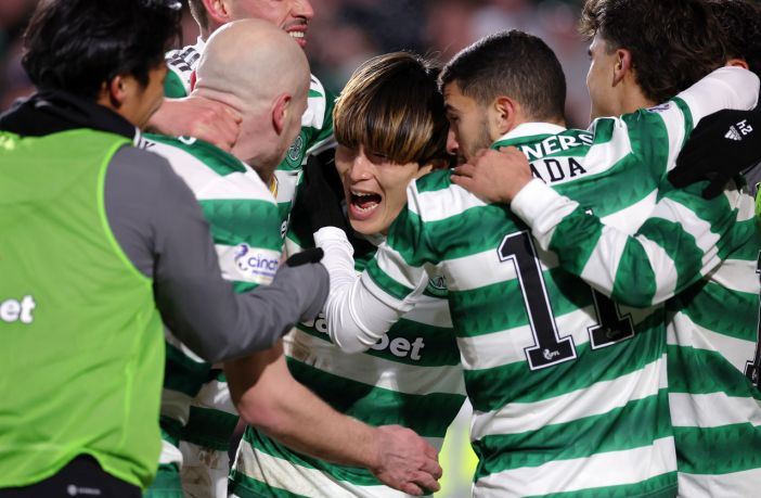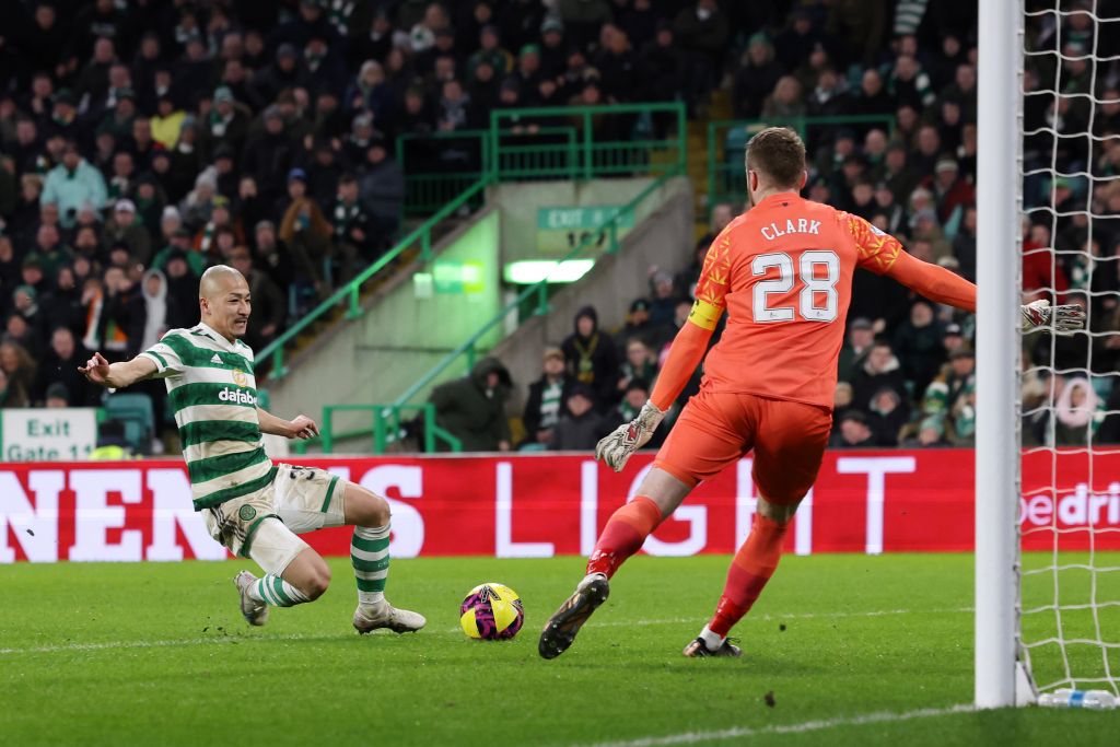 Daizen Maeda of Celtic scores the equaliser during the Cinch Scottish Premiership match between Celtic FC and Heart of Midlothian at Celtic Park on March 08, 2023. (Photo by Ian MacNicol/Getty Images)