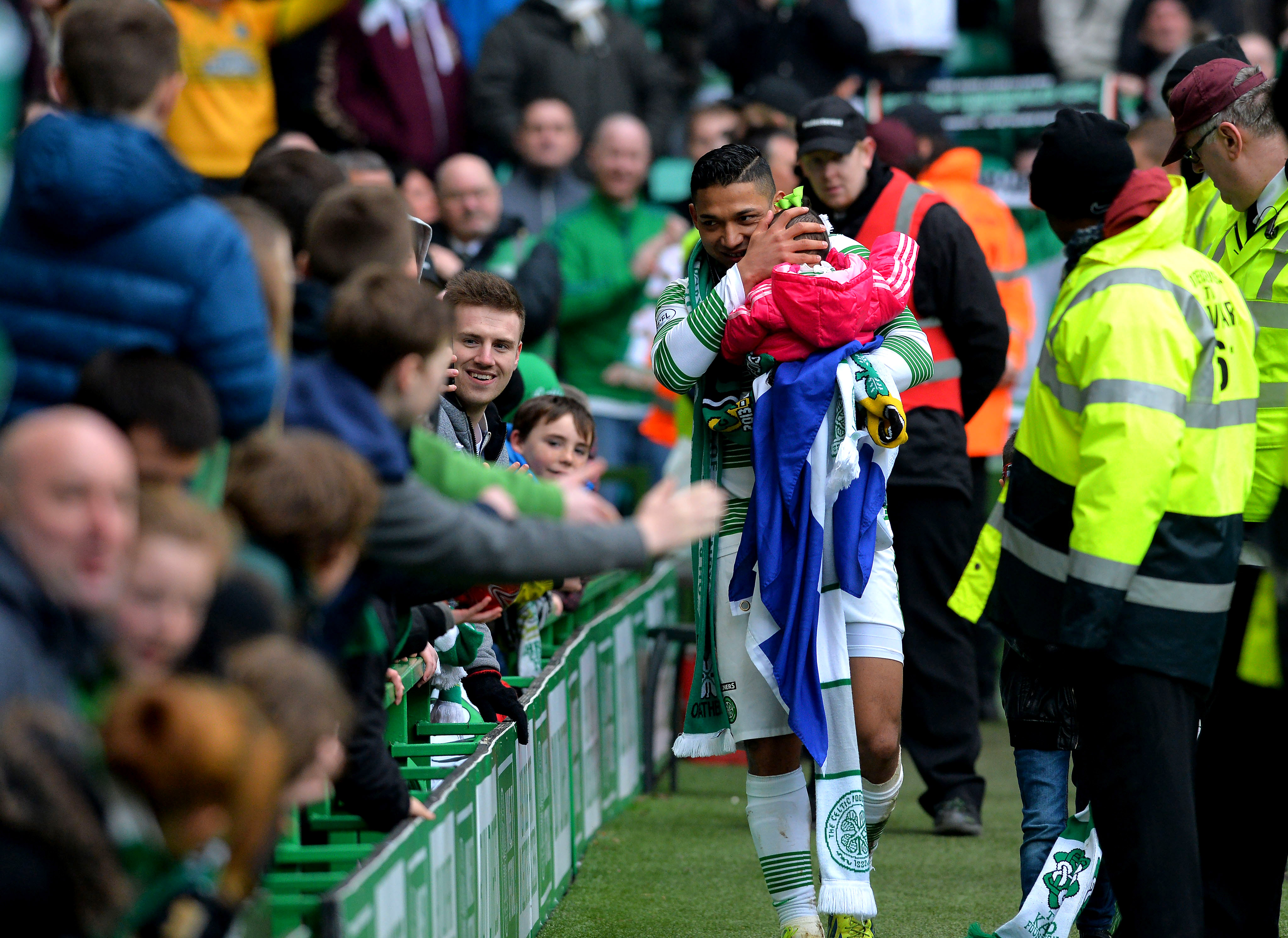 Emilio Izaguirre with his children meets the fans and celebrating Celtic winning the 2013-2014 Championship after the Scottish Premier League match between Celtic and Ross County at Celtic Park on March 29, 2014.. (Photo by Mark Runnacles/Getty Images)