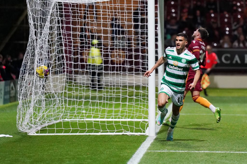 Motherwell v Celtic – Premier Sports Cup – Quarter Final – Liel Abada celebrates scoring our first goal at Fir Park, on Wednesday October 19, 2022. Photo Jane Barlow