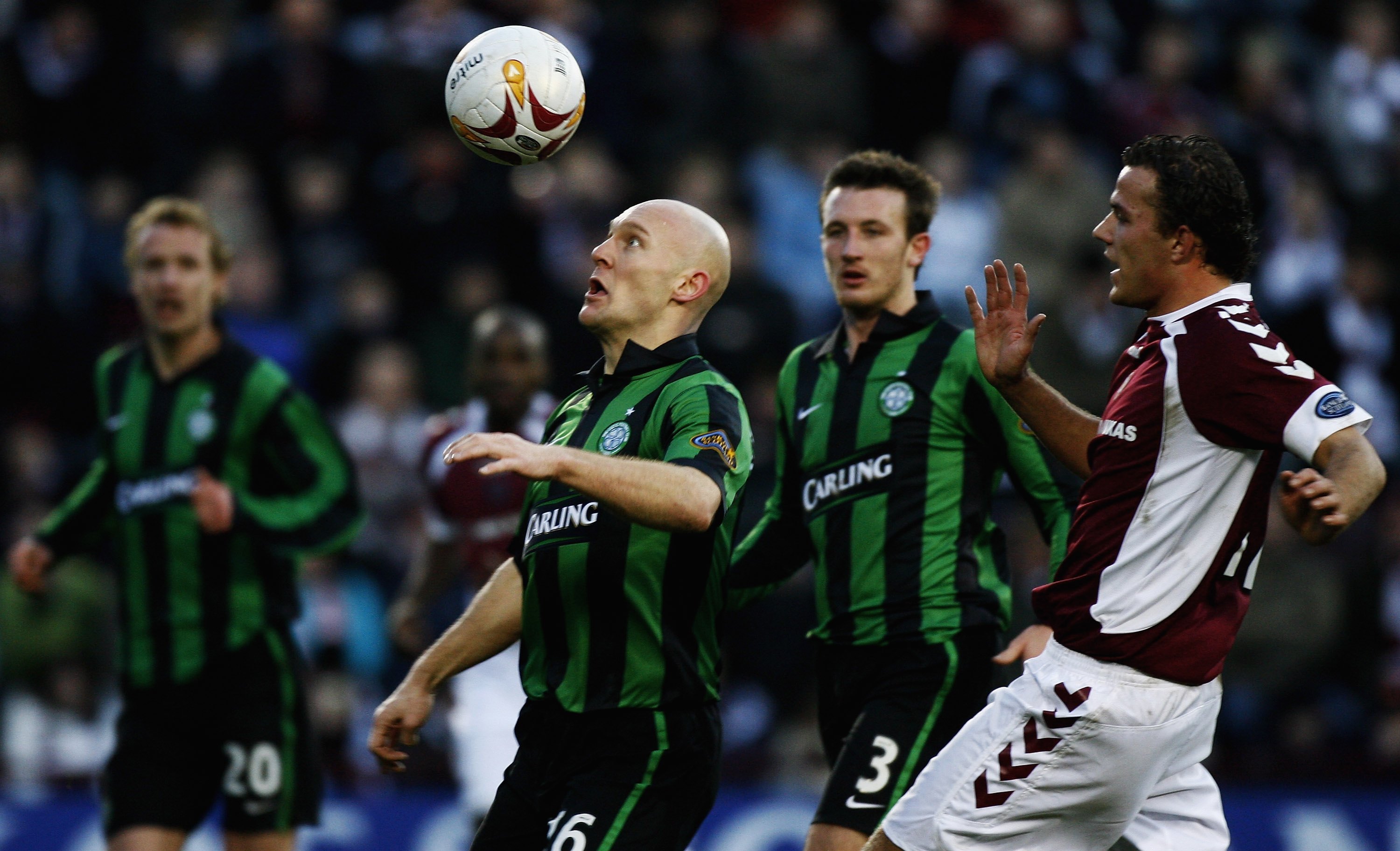 Ibrahim Tall of Hearts tackles Thomas Gravesen of Celtic during the Scottish Premier division match between Hearts and Celtic at Tynecastle Park on January 14,2006 (Photo by Jeff J Mitchell/Getty Images)