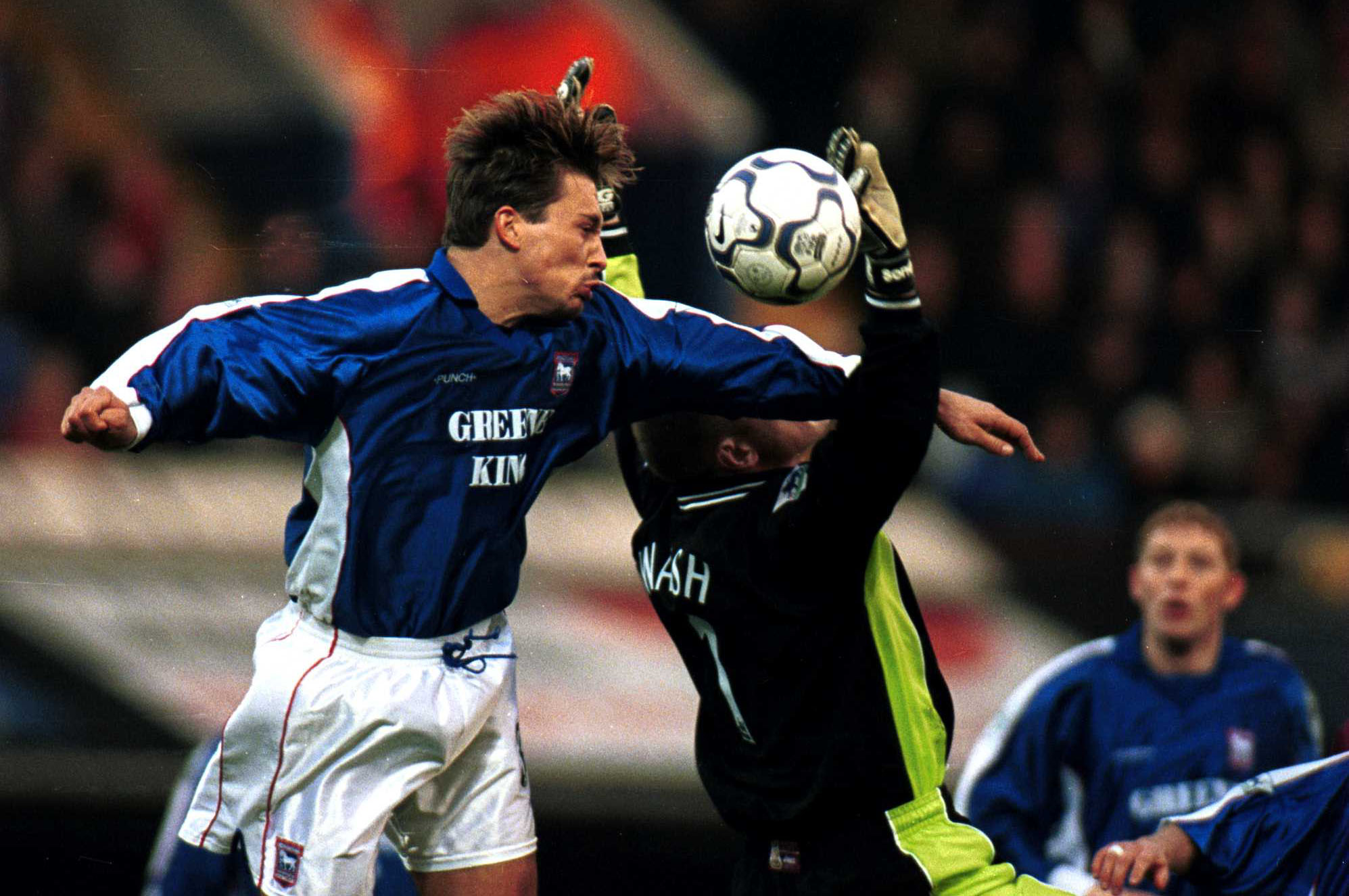 - 4 Mar 2001: Mark Burchill of Ipswich wins the ball in the air from goalkeeper Gary Walsh of Bradford during the match between Ipswich Town and Bradford City in the FA Carling Premiership at Portman Road, Ipswich. Mandatory Credit: Mike Hewitt/ALLSPORT