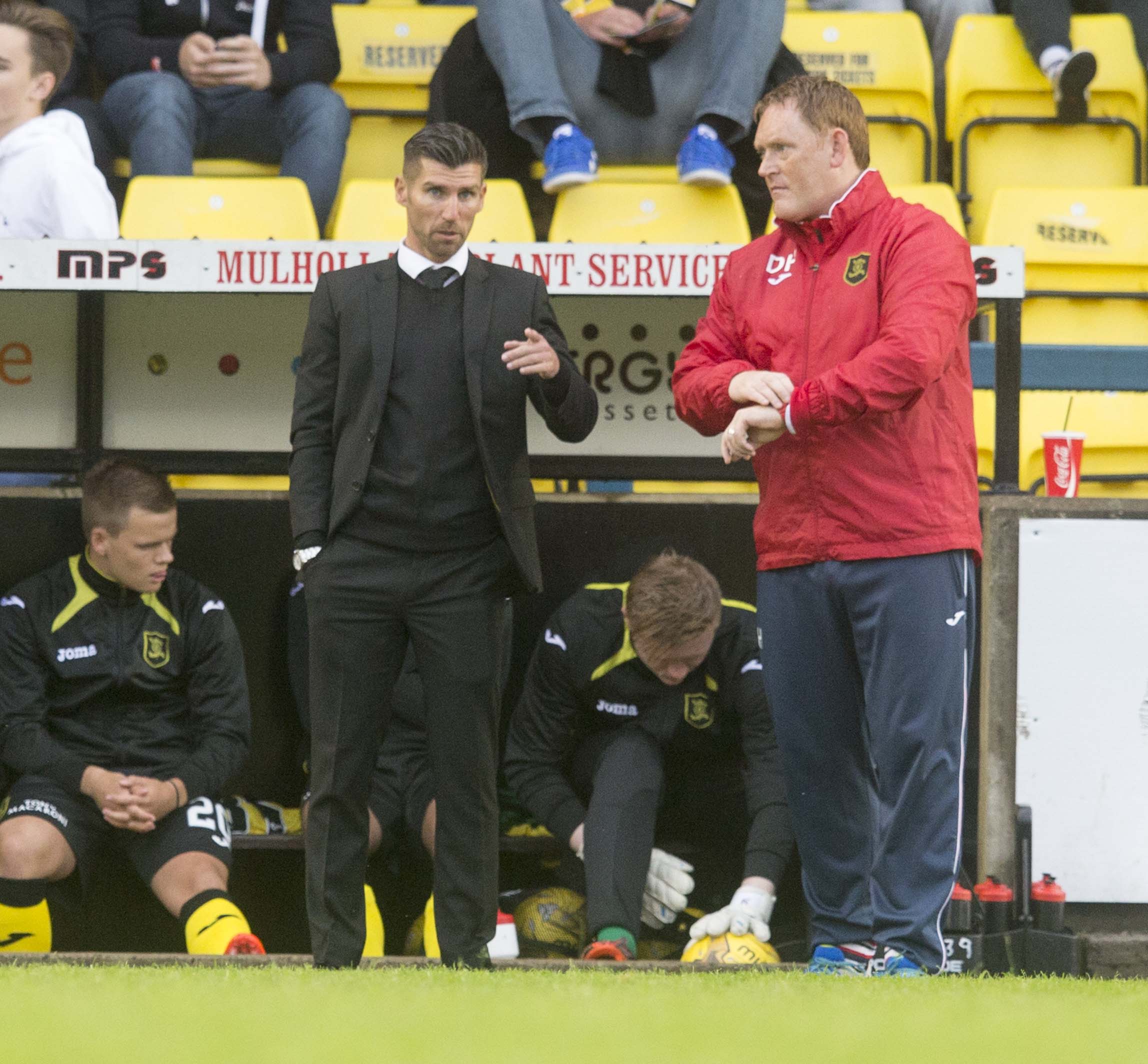 - LIVINGSTON, SCOTLAND – JULY 13: Manager Mark Burchill (L) of Livingston with assistant David Hopkins during the Pre Season Friendly between Livingston and Real Sociedad at the City Stadium on July 13th, 2015 in Livingston, Scotland. (Photo by Jeff Holmes/Getty Images)