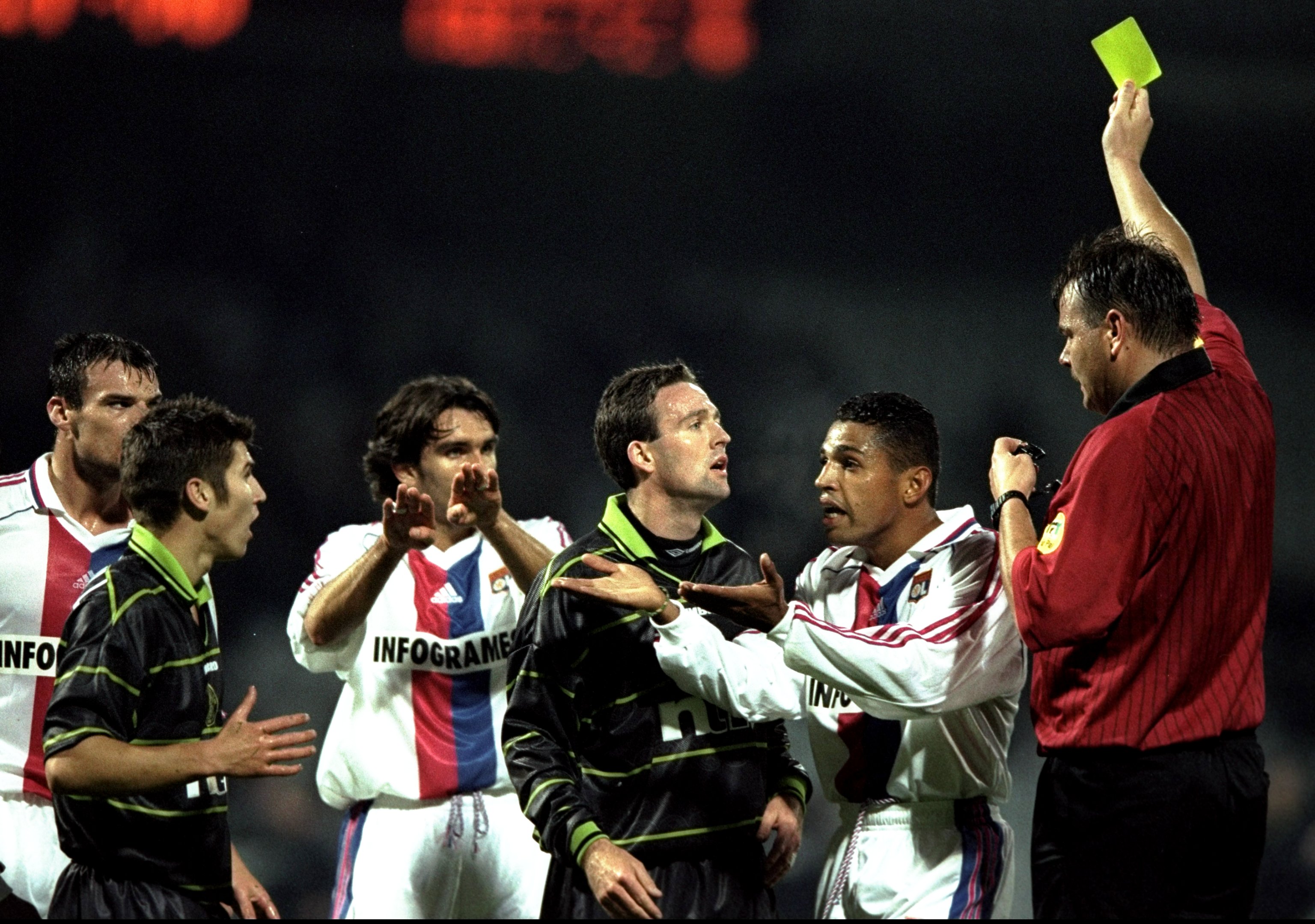 - 21 Oct 1999: Mark Burchill of Celtic (second left) is booked by referee Rene Temmink during the UEFA Cup second round first leg match against Lyon at the Stade Gerland in Lyon, France. Lyon won 1-0. Mandatory Credit: Clive Brunskill /Allsport
