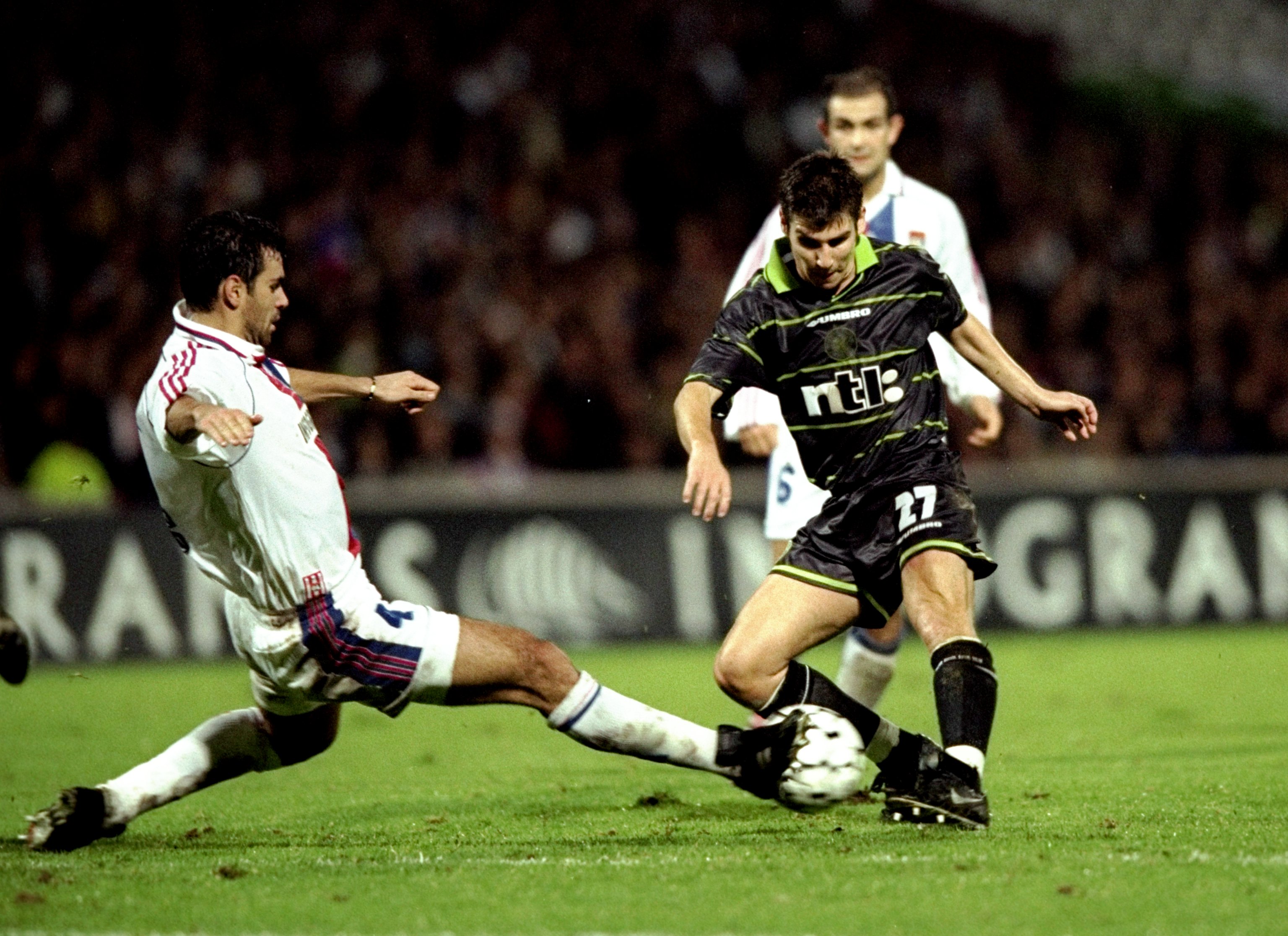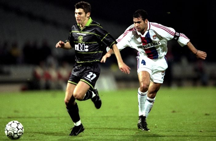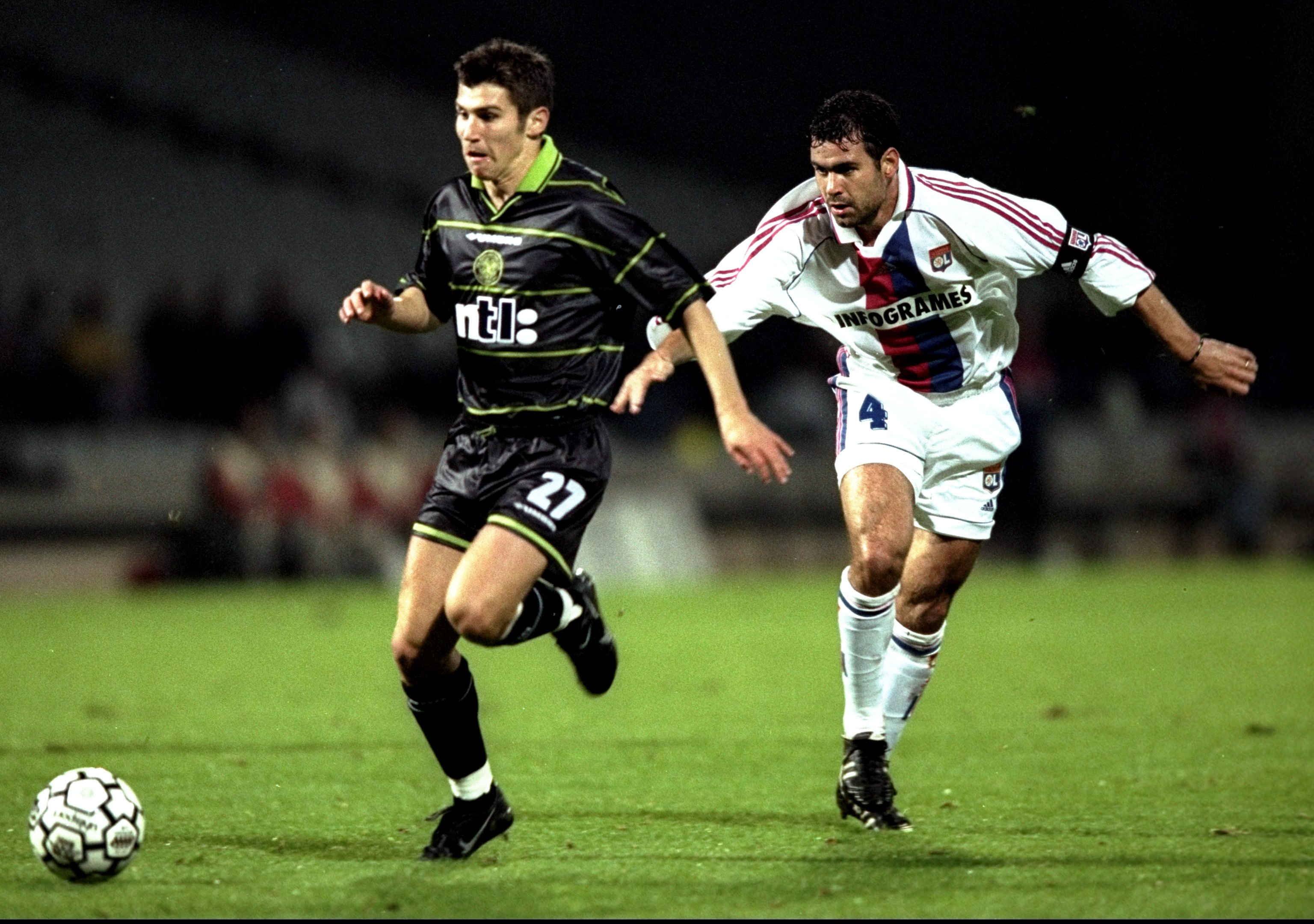 - 21 Oct 1999: Mark Burchill of Celtic goes past Florent Laville of Lyon during the UEFA Cup second round first leg match at the Stade Gerland in Lyon, France. Photo Clive Brunskill /Allsport