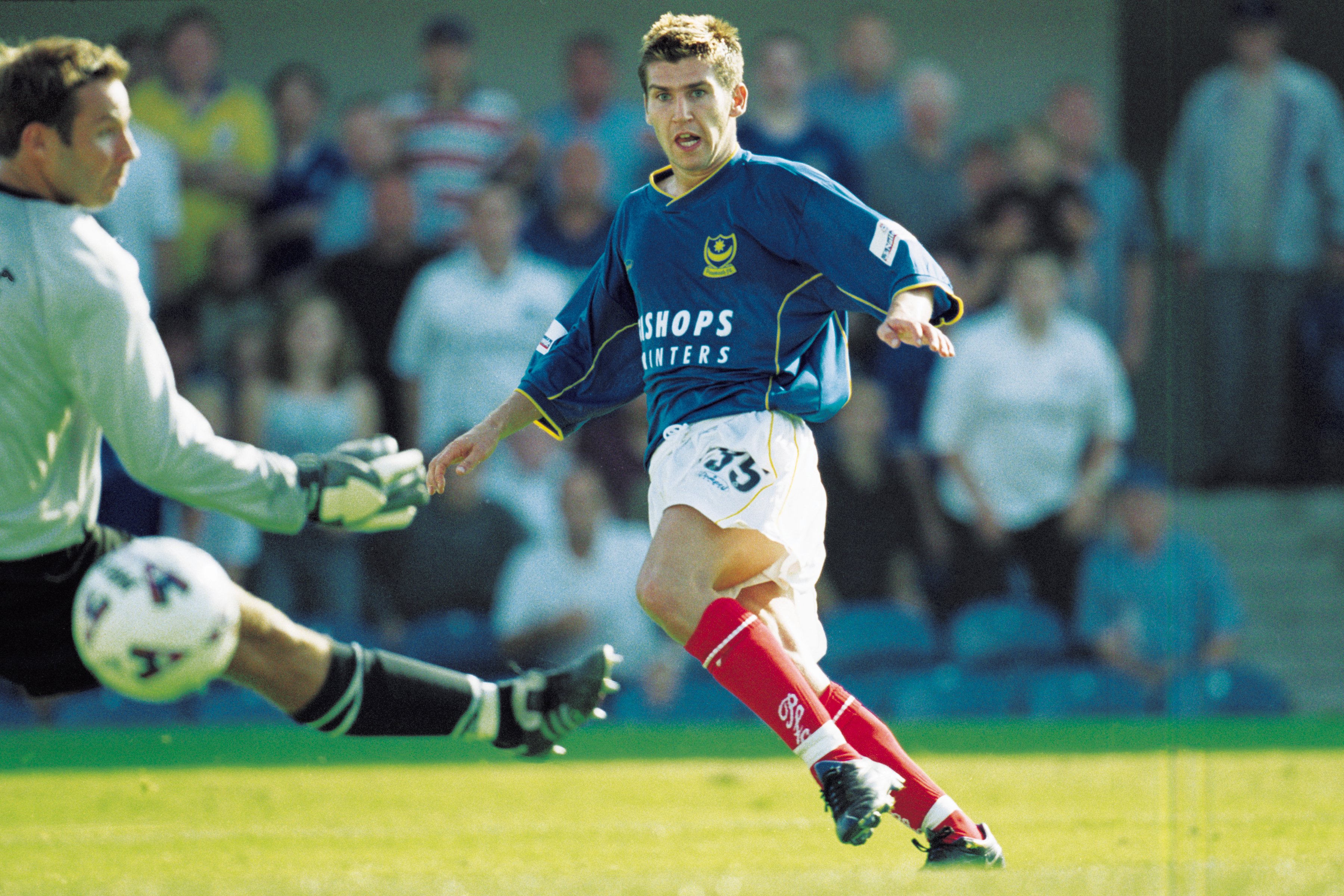 - 27 Aug 2001: Mark Burchill scores for Portsmouth during the Nationwide Division One match between Portsmouth and Grimsby played at Fratton Park in Portsmouth in England. Portsmouth won the match 4 – 2. Mandatory Credit: Mike Hewitt /Allsport