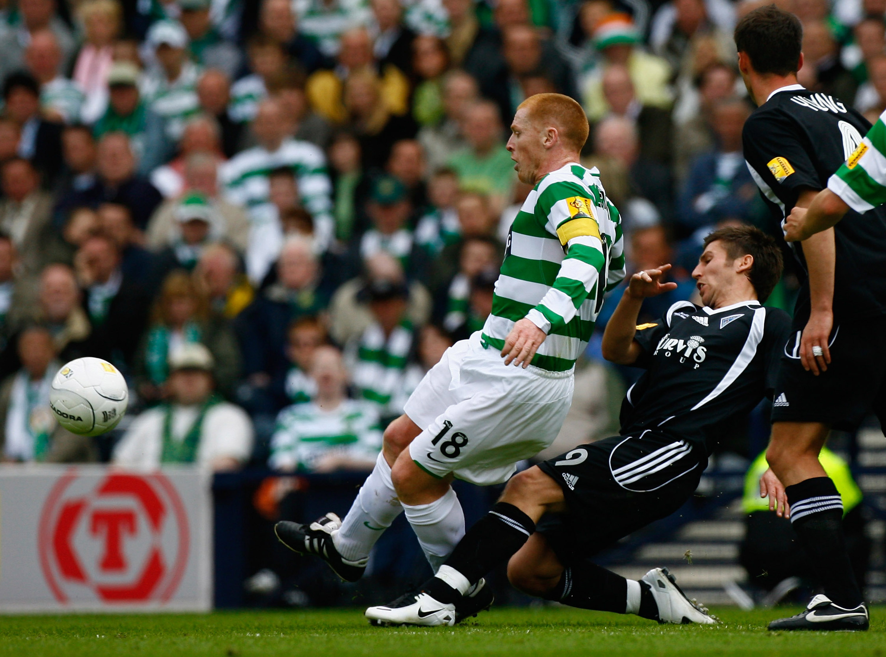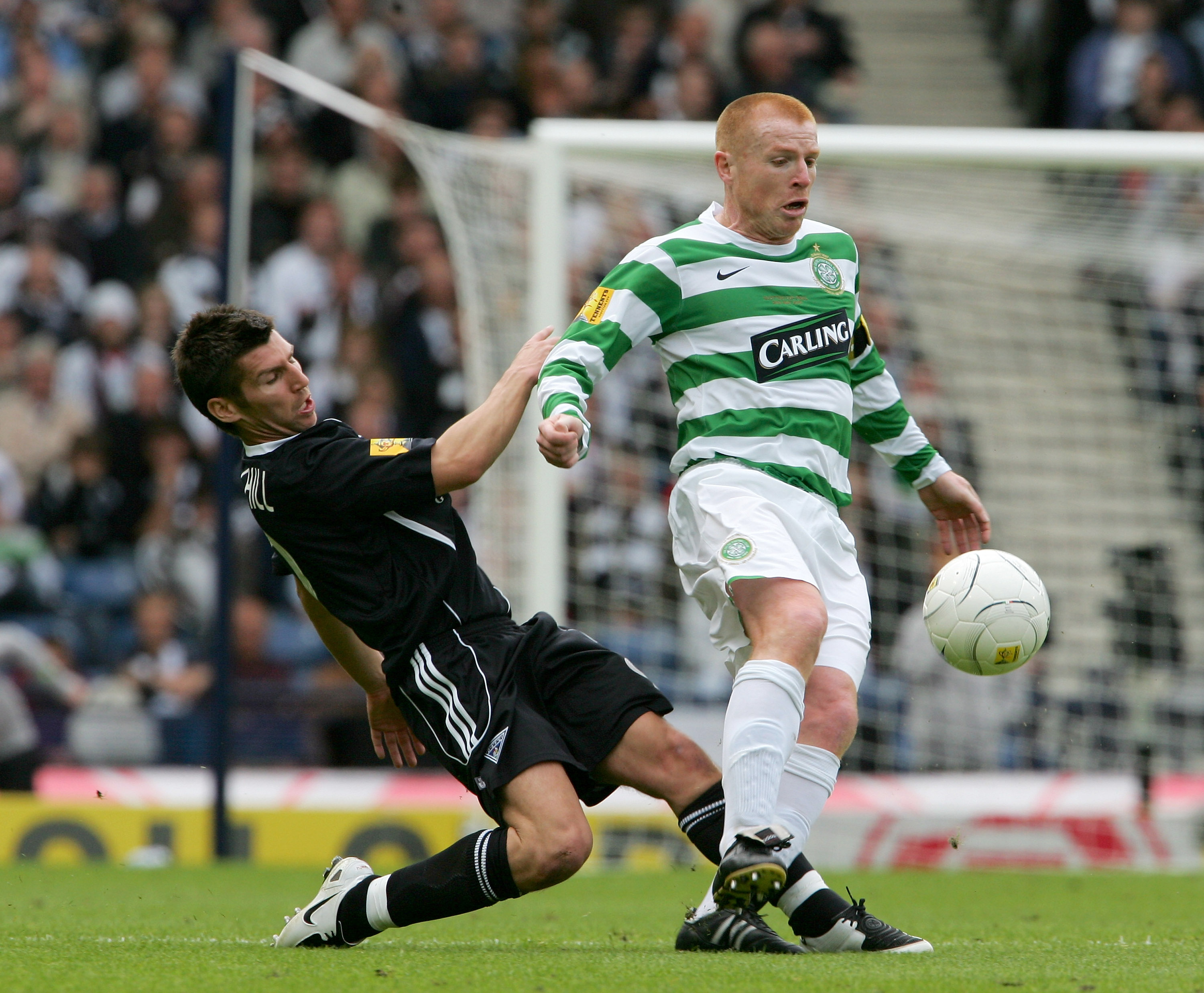 - GLASGOW, UNITED KINGDOM – MAY 26: Neil Lennon of Celtic gets tackled by Mark Burchill of Dunfermline Athletic during the Tennents Scottish Cup Final at Hampden Park on May 26, 2007 in Glasgow, Scotland.(Photo by Phil Cole/Getty Images)