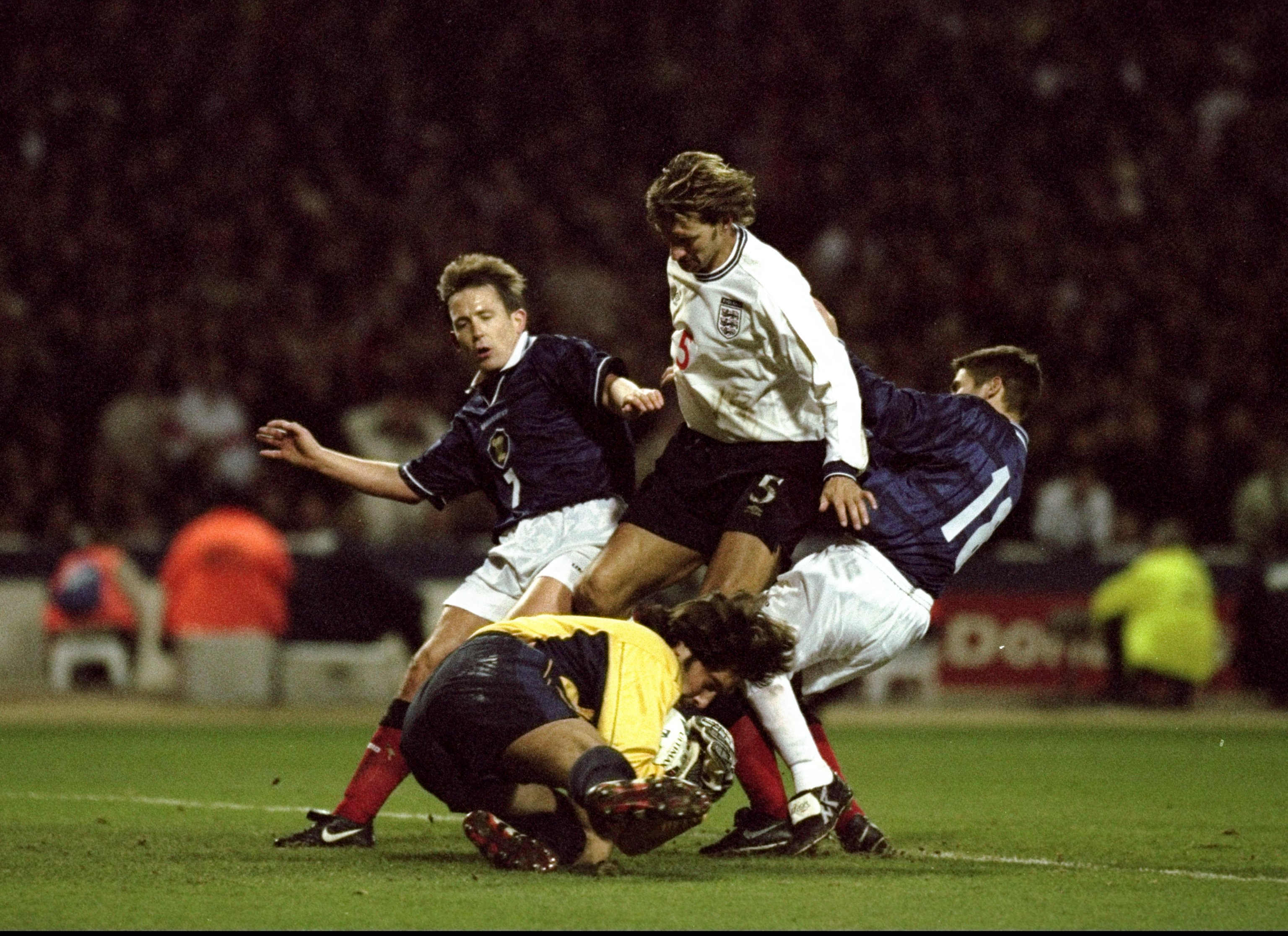- 17 Nov 1999: David Seaman of England is protected by Tony Adams (#5) and collects the ball as Billy Dodds and Mark Burchill of Scotland close in during the Euro 2000 play-off second leg match at Wembley Stadium, London. Scotland won the game 1-0, but England progress to Euro 2000 courtesy of a 2-1 aggregate scoreline. Mandatory Credit: Ross Kinnaird /Allsport